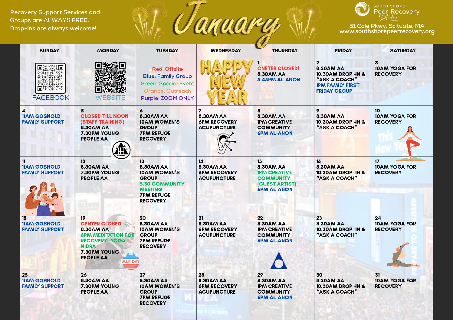 Center will be closed January 19th for Martain Luther King day, both AA meetings and Meditation for Recovery will still meet this day.