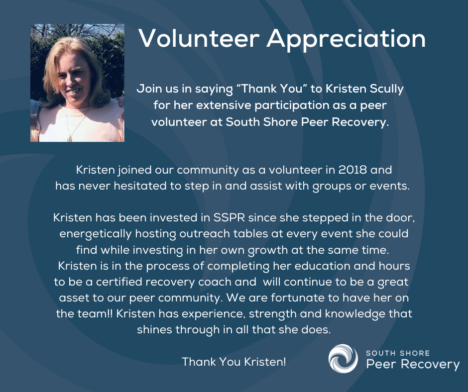 We appreciate your interest in our volunteer program. Since the beginning South Shore Peer Recovery has depended on volunteers and we could not do it without your help.